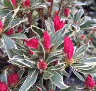 - Foliage: Glossy green leaves with creamy white or yellow variegated margins; foliage turns burgundy or reddish in fall and winter.