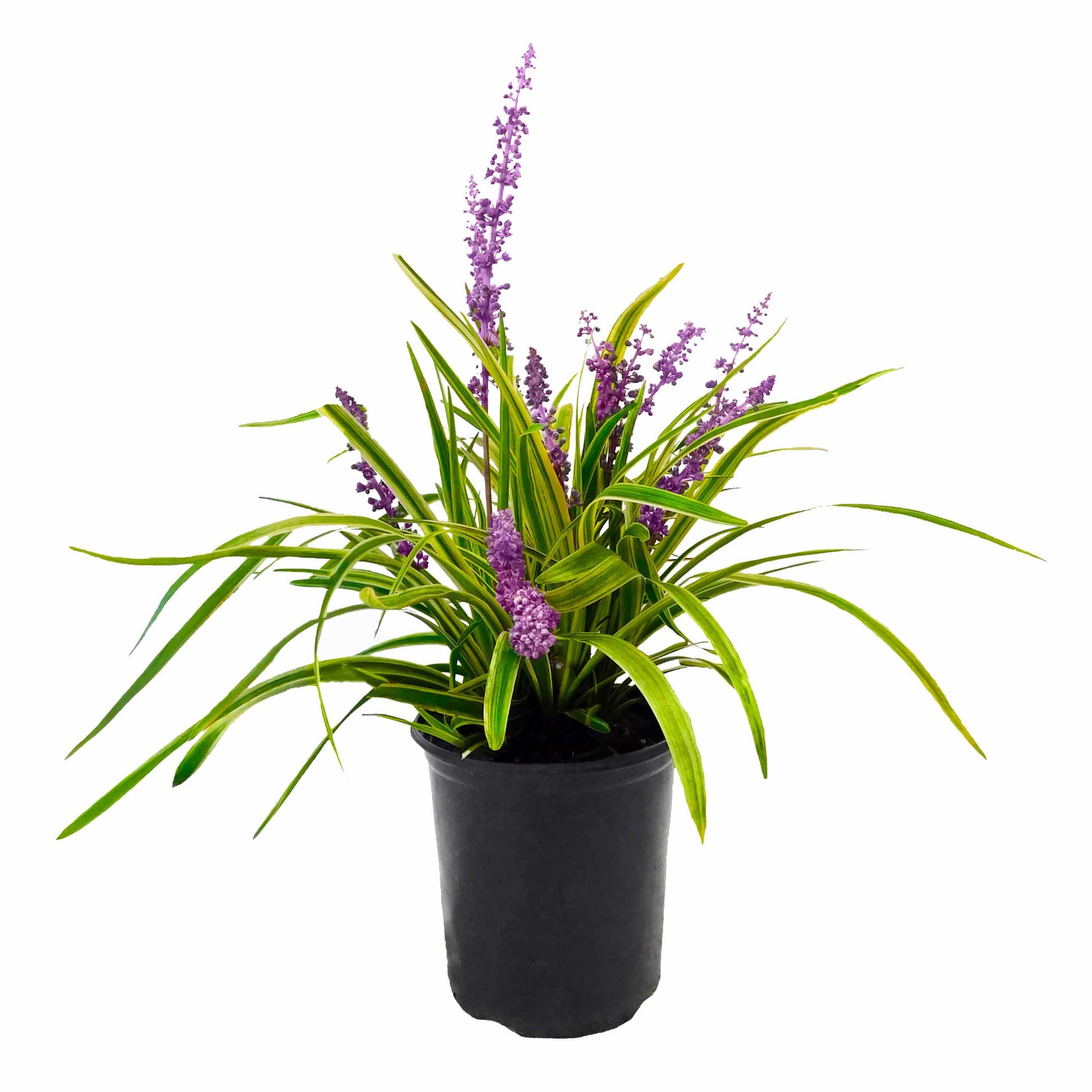 Liriope Variegated (Liriope muscari 'Variegata') is a hardy, evergreen perennial ground cover prized for its striking green leaves edged in creamy yellow. This low-maintenance plant forms graceful, arching clumps that add vibrant color and texture to borders, pathways, mass plantings, and around trees or shrubs. In late summer, it produces spikes of lavender-purple flowers that rise above the foliage, followed by small black berries for added seasonal interest. Liriope Variegated thrives in sun or shade, adapts to a wide range of soils, and provides excellent erosion control, making it a favorite for both residential and commercial landscapes.