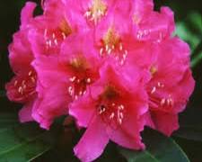 Large, rounded trusses of rosy pink, trumpet-shaped flowers with golden yellow blotches (mid to late spring)